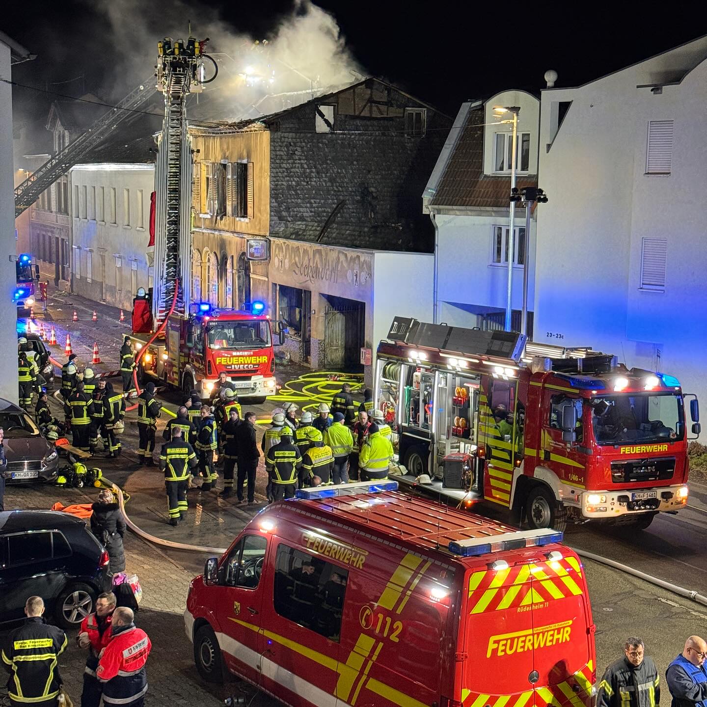 Für die Rotkreuzlerinnen und Rotkreuzler war der Weg zum Einsatzort in Bad Kreuznach am Freitagnachmittag nicht weit. Unmittelbar gegenüber der Gebäude des DRK-Kreisverband Bad Kreuznach e.V. in der Rüdesheimer Straße geriet ein Wohnhaus mitsamt Nebengebäude in Vollbrand.