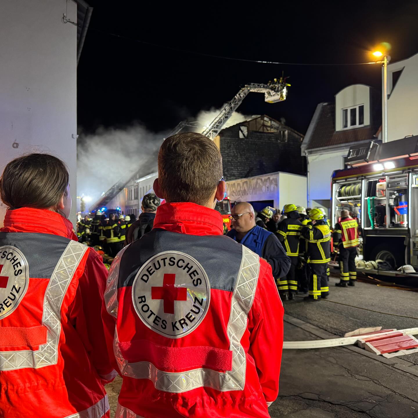 Da erste Löschversuche durch DRK-Mitarbeiter erfolglos blieben und das Feuer schnell den gesamten Gebäudekomplex erfasste, wuchs der Einsatz sehr schnell auf eine Stärke von rund 150 Einsatzkräften der Feuerwehren. Von Beginn des Einsatzes an sorgten die Rotkreuzler der DRK-Einsatzeinheit für die Versorgung der Einsatzkräfte mit Getränken, denn aufgrund der absehbar langen Einsatzdauer, alarmierte die integrierte Leitstelle Bad Kreuznach gegen 16:00 Uhr die Schnelleinsatzgruppe Verpflegung des Landkreises, welche ebenfalls vom Roten Kreuz gestellt wird.