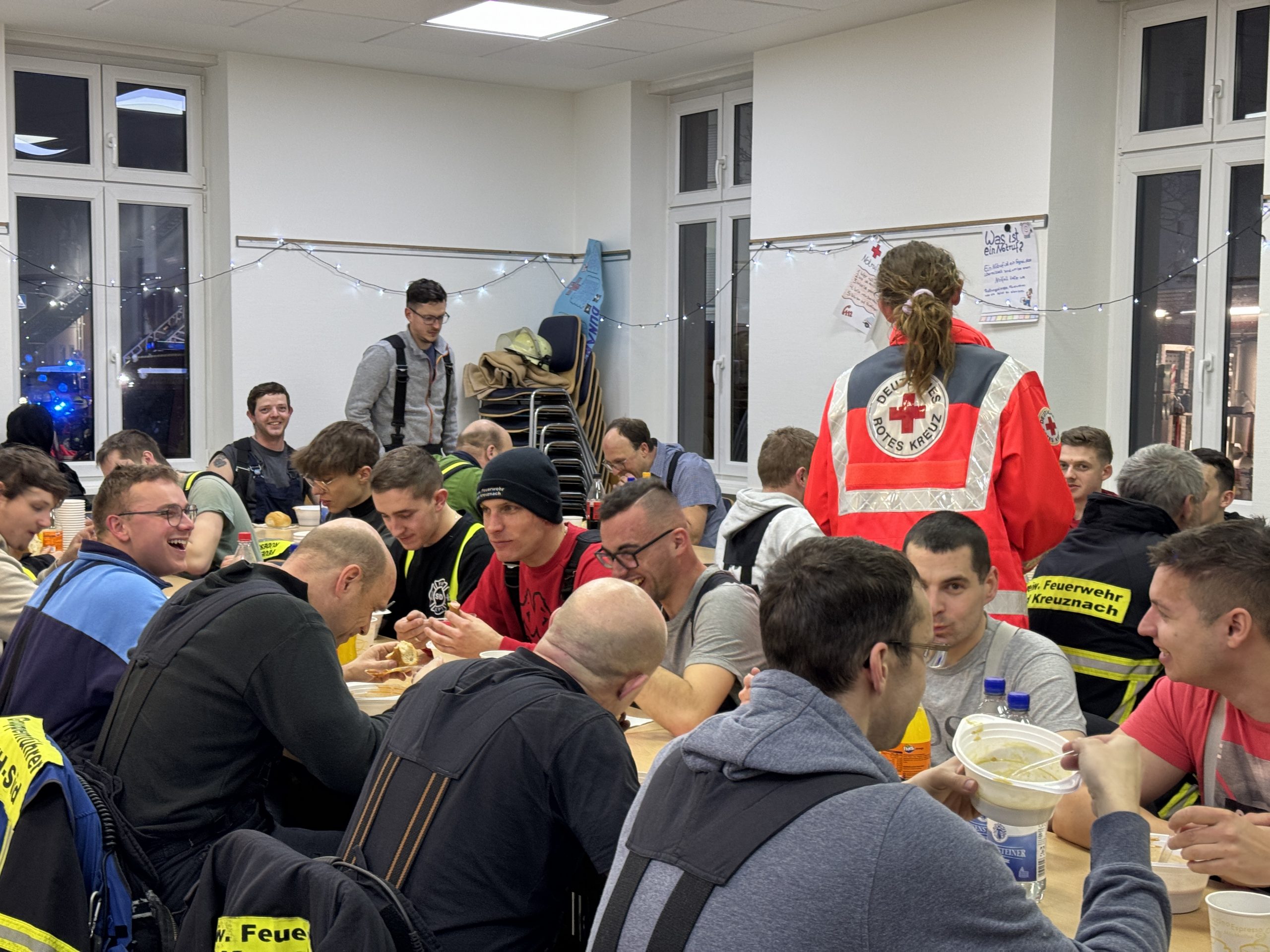 Gegen 21:00 Uhr war bereits absehbar, dass die Löscharbeiten noch mehrere Stunden andauern werden. Daher organisierten die Verpflegungsspezialisten des Roten Kreuzes in umliegenden Märkten weitere Brötchen, Wurst und Suppe.
